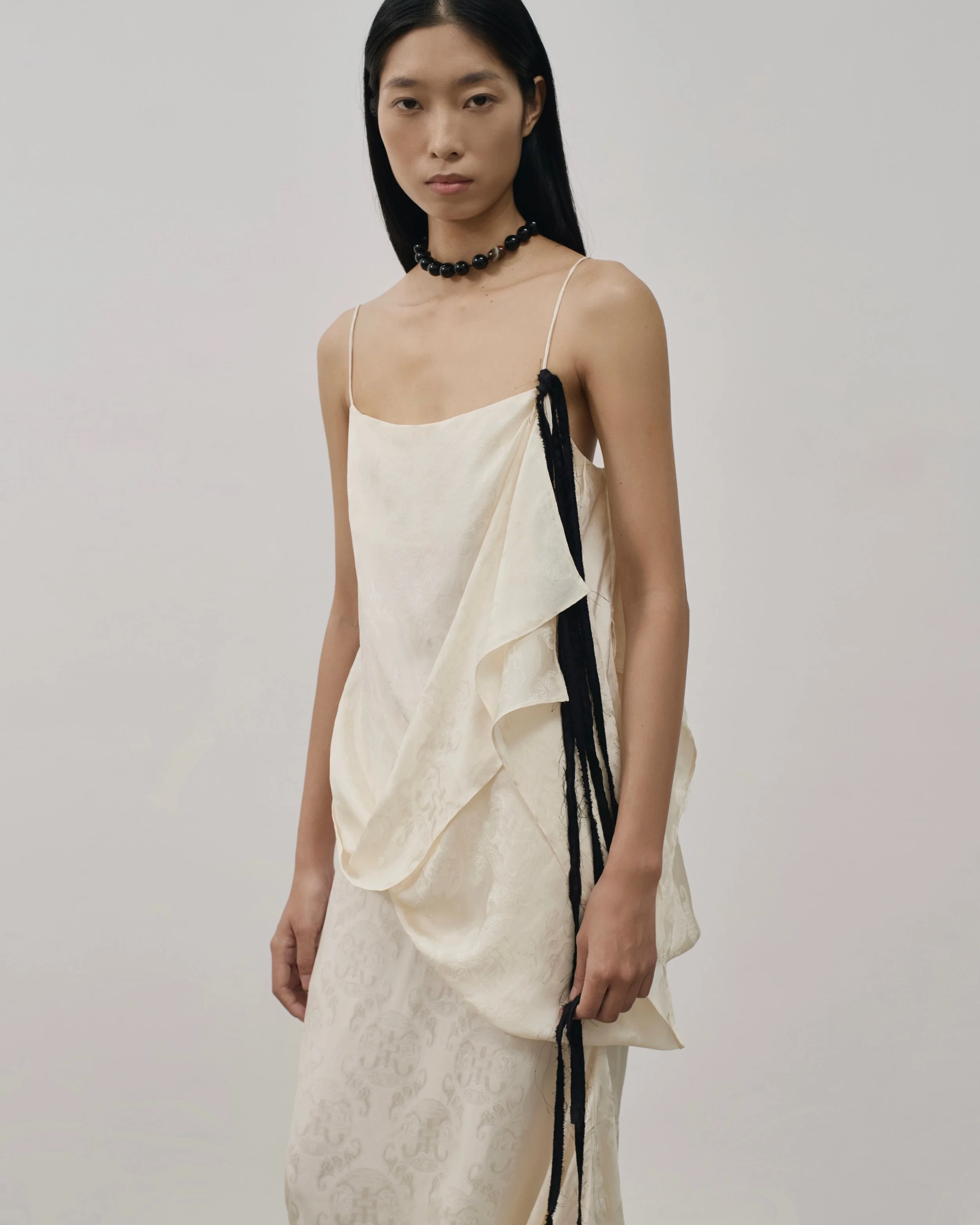 Lightweight draped camisole in Vietnamese silk-blend traditional brocade, cowl back with string