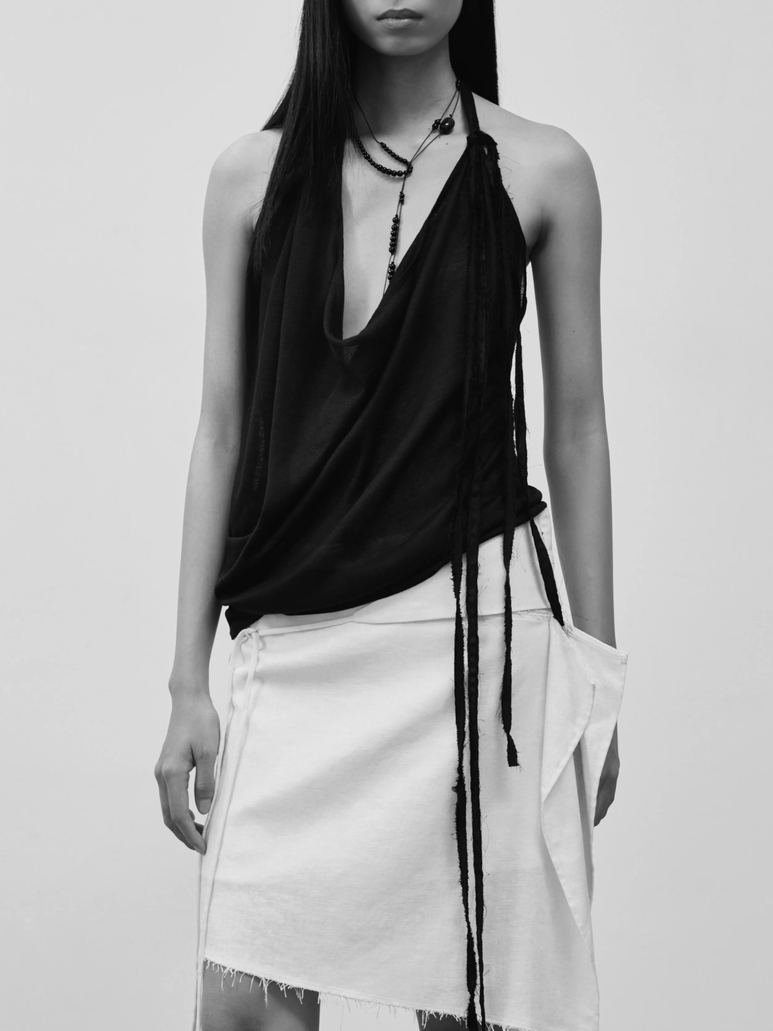 Lightweight halter top in Vietnamese silk traditional brocade with asymmetrical draped detail, detachable styling strings