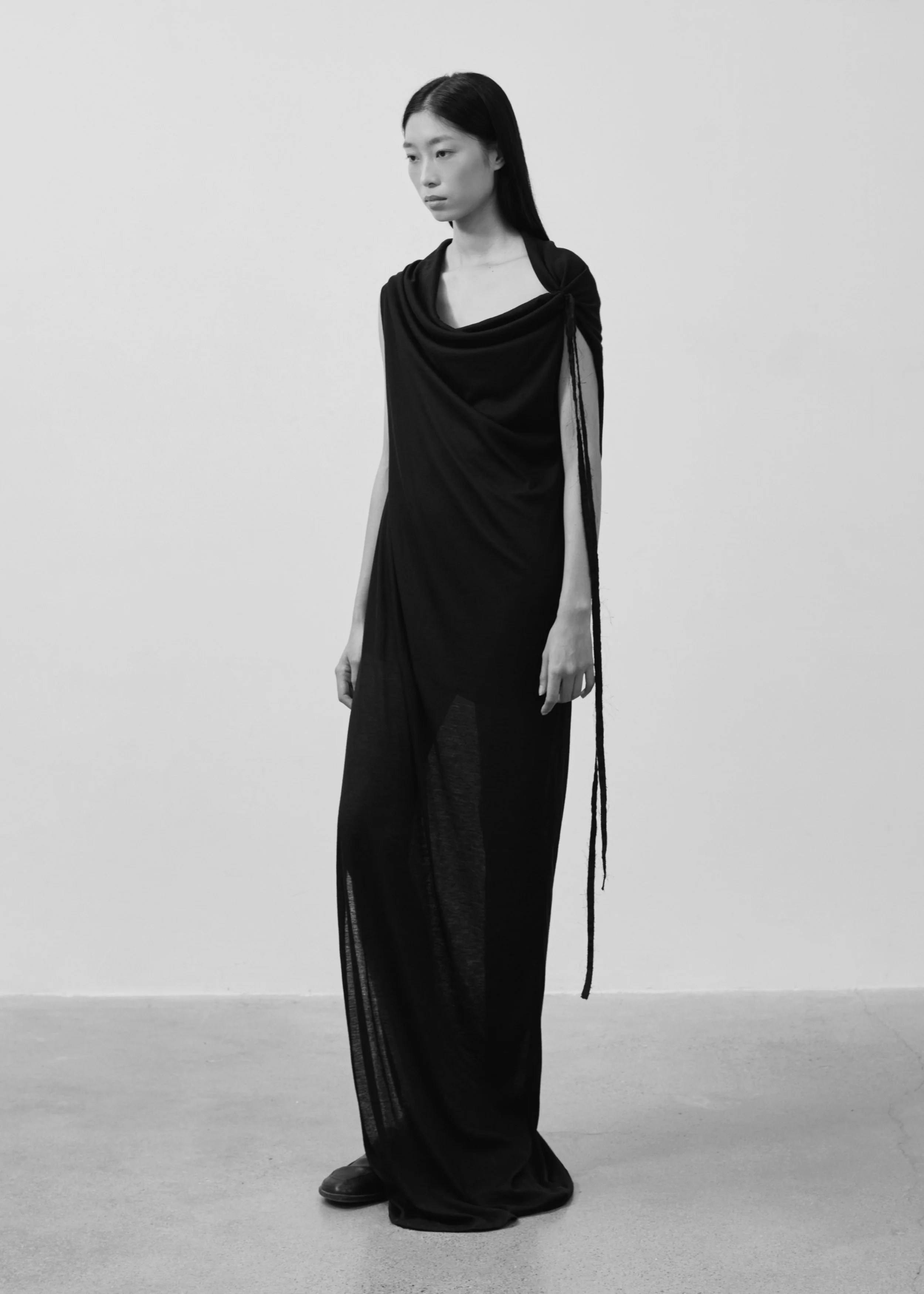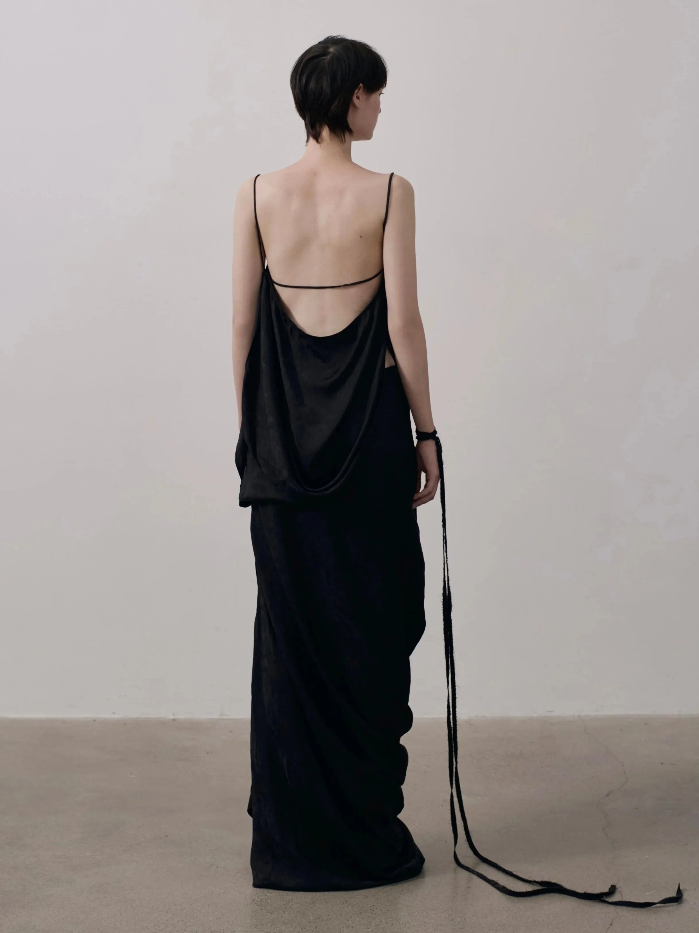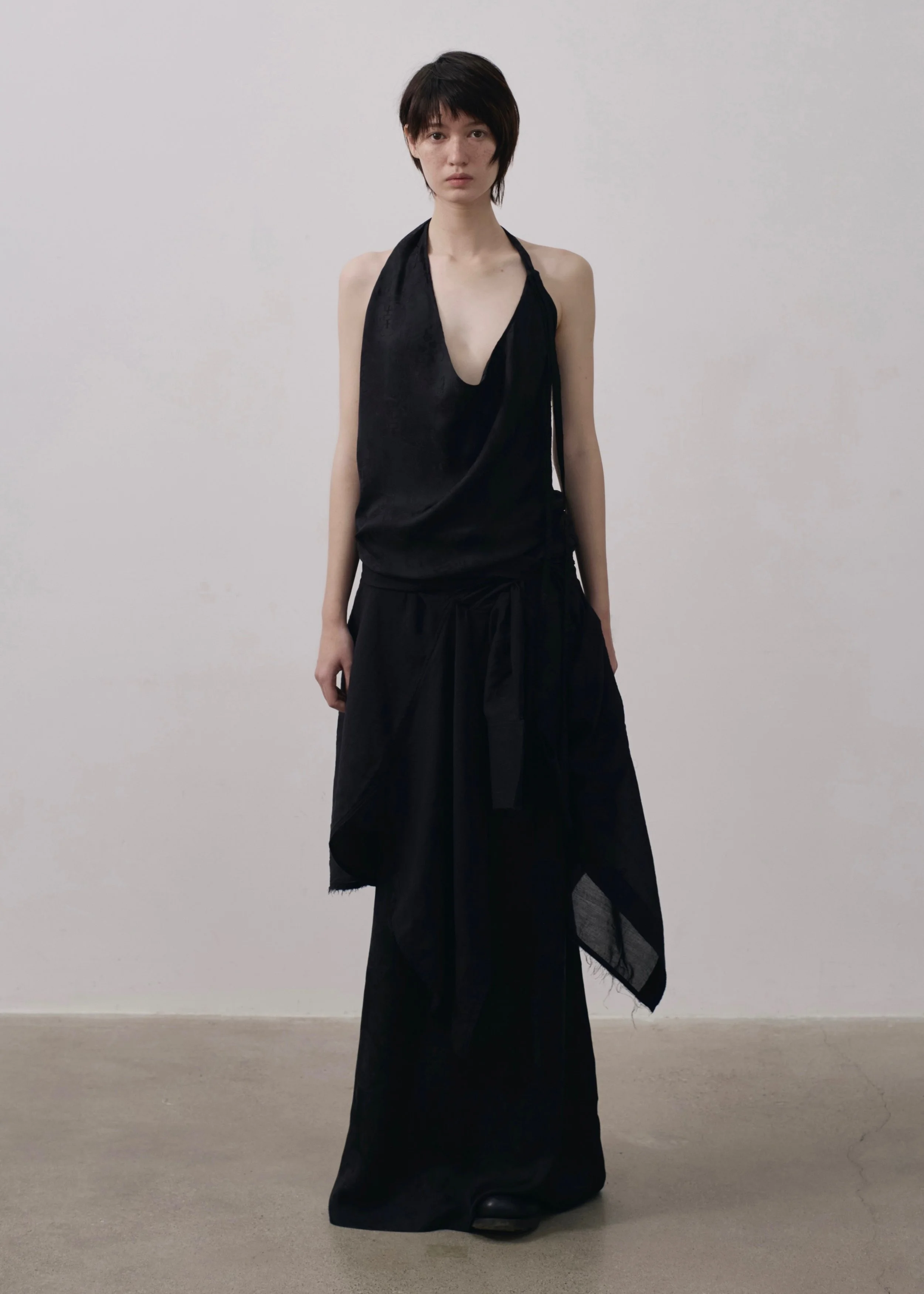 Maxi length halter dress with asymmetrical draped detail, cowl-neck, open back, detachable styling strings