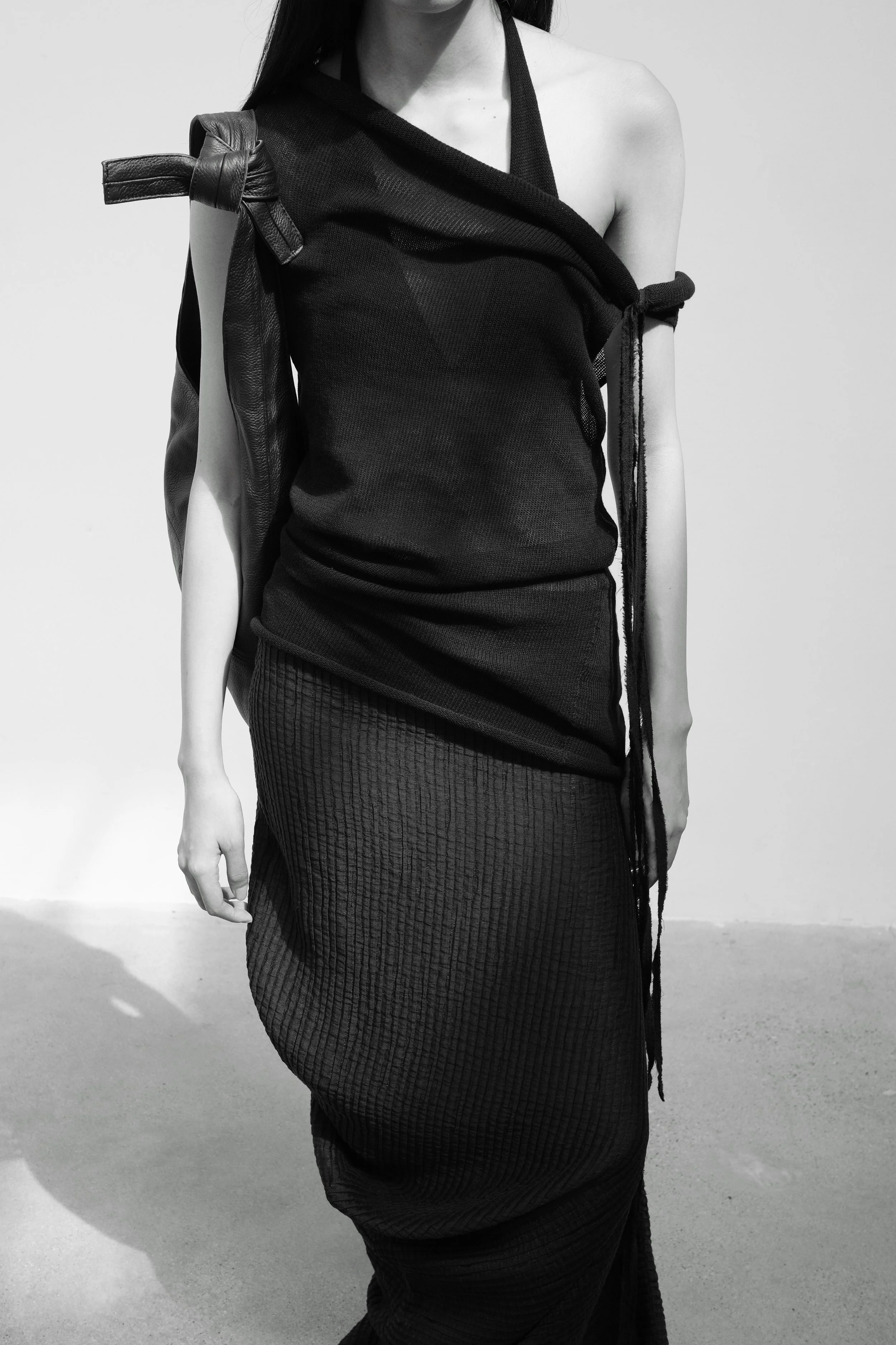 Stretchy sleeveless top, hand-knitted in fine yarn, can be worn multiple ways
