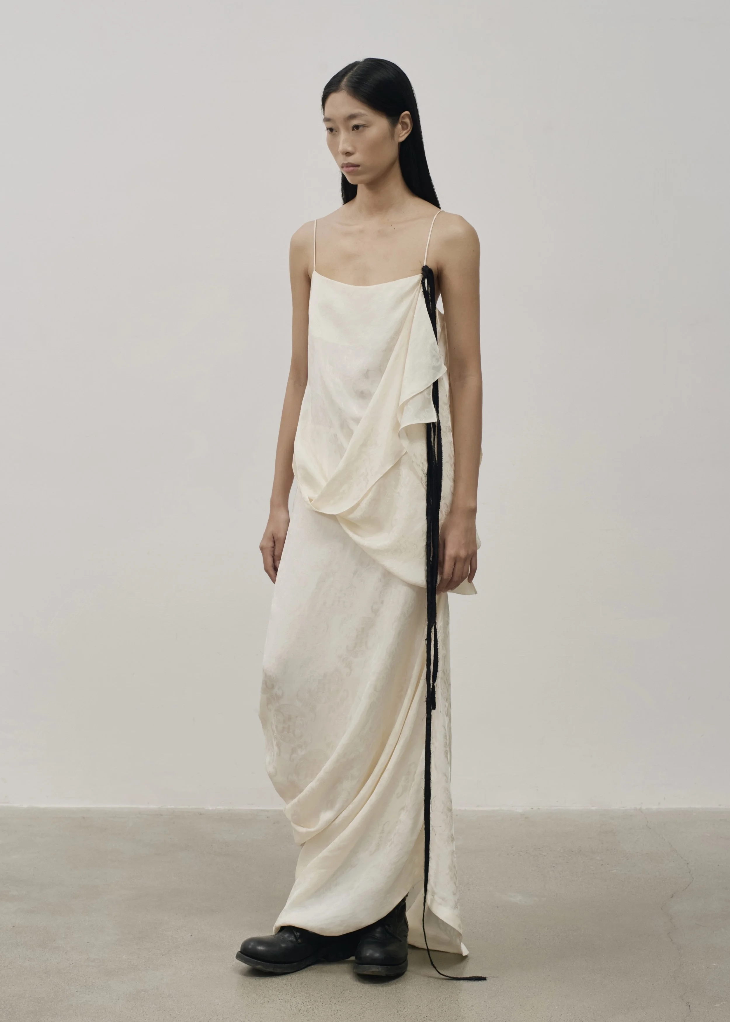 Maxi length halter dress in Vietnamese silk-blend traditional brocade with asymmetrical draped detail, cowl-neck, open-back, detachable styling strings